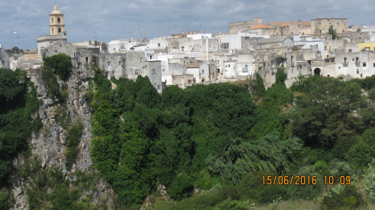 Schock,am Morgen regnet es in Vieste! Das trübt meine Stimmung sofort ziemlich und ich stelle mich schon auf einen langweiligen Tag im Zelt ein. Um ca. 11 Uhr wird’s dann doch wieder deutlich besser, und ich mache mich auf eine Rundtour durch den Gargano. Schon erstaunlich, wie die Stimmung durch ein bisschen Sonnenschein gleich wieder erheblich steigt. Ein Stück noch die herrliche Küste entlang, dann geht’s ins Landesinnere nach Monte Saint Angelo. Der Nördlichere Teil des Gargano ist ziemlich dicht bewaldet, im Gegensatz zur eher karstigen Landschaft im Süden.