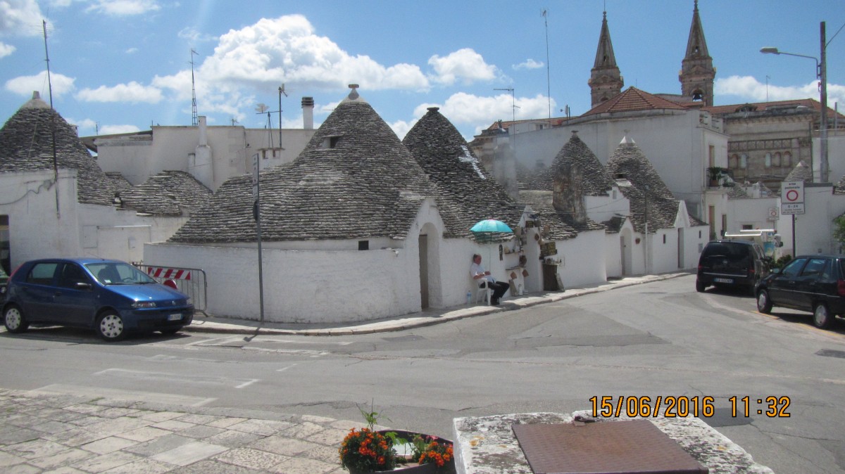 Im Land der Trulli. Ich verlasse Matera in Richtung Osten und fahre noch 2 kleinere Orte an, die ähnlich wie Matera, über Höhlenwohnungen verfügen, nur wesentlich kleiner. Bald bin ich dann auch schon in der Region Apulien. Es dauert nicht lange, und da sehe ich auch schon den ersten Trullo. Trullo, Mehrzahl Trulli, ist eine Bezeichnung für die vor allem in Apulien vorkommenden Rundhäuser, deren Steindächer sich nach oben hin in einem Kraggewölbe (sogenanntes „falsches Gewölbe“) verjüngen und mit einem symbolischen Schlussstein, dem Zippus, oft aber auch mit einer Kugel oder einem anderen Symbol, abgeschlossen werden. Trulli sind aus Trockenmauerwerk und werden ohne Mörtel errichtet. Die schuppenartigen dunklen Bruchsteindächer geben dem weiß getünchten Trullo, der ursprünglich in den Feldern und nicht im Ort stand, sein charakteristisches Aussehen. Durch ihre Bauweise aus massivem Naturstein mit sehr dicken Wänden und winzigen Fenstern bieten sie einen guten Schutz gegen die anhaltende Sommerhitze in Apulien, da sich das Innere nur langsam aufheizt. Im Winter hingegen speichert ein Trullo die Wärme, die durch einen offenen Kamin erzeugt wird. Die bis zur Mitte des letzten Jahrhunderts vergessenen ‚Arme-Leute-Häuser‘ erlebten nun eine Renaissance, einige werden mittlerweile auch als Ferienwohnungen angeboten. In Alberobello existiert ein weiträumiges geschlossenes Viertel, das gänzlich mit Trullis bebaut ist. Dieses zählt seit 1996 zum Weltkulturerbe der UNESCO. Viele davon haben aber m. E. Nichts mehr mit den Ursprünglichen zu tun. Auf dem Land sieht man aber doch noch einige alte ursprüngliche Trullis. Sie sehen schon irgendwie lustig aus, so in der Landschaft.