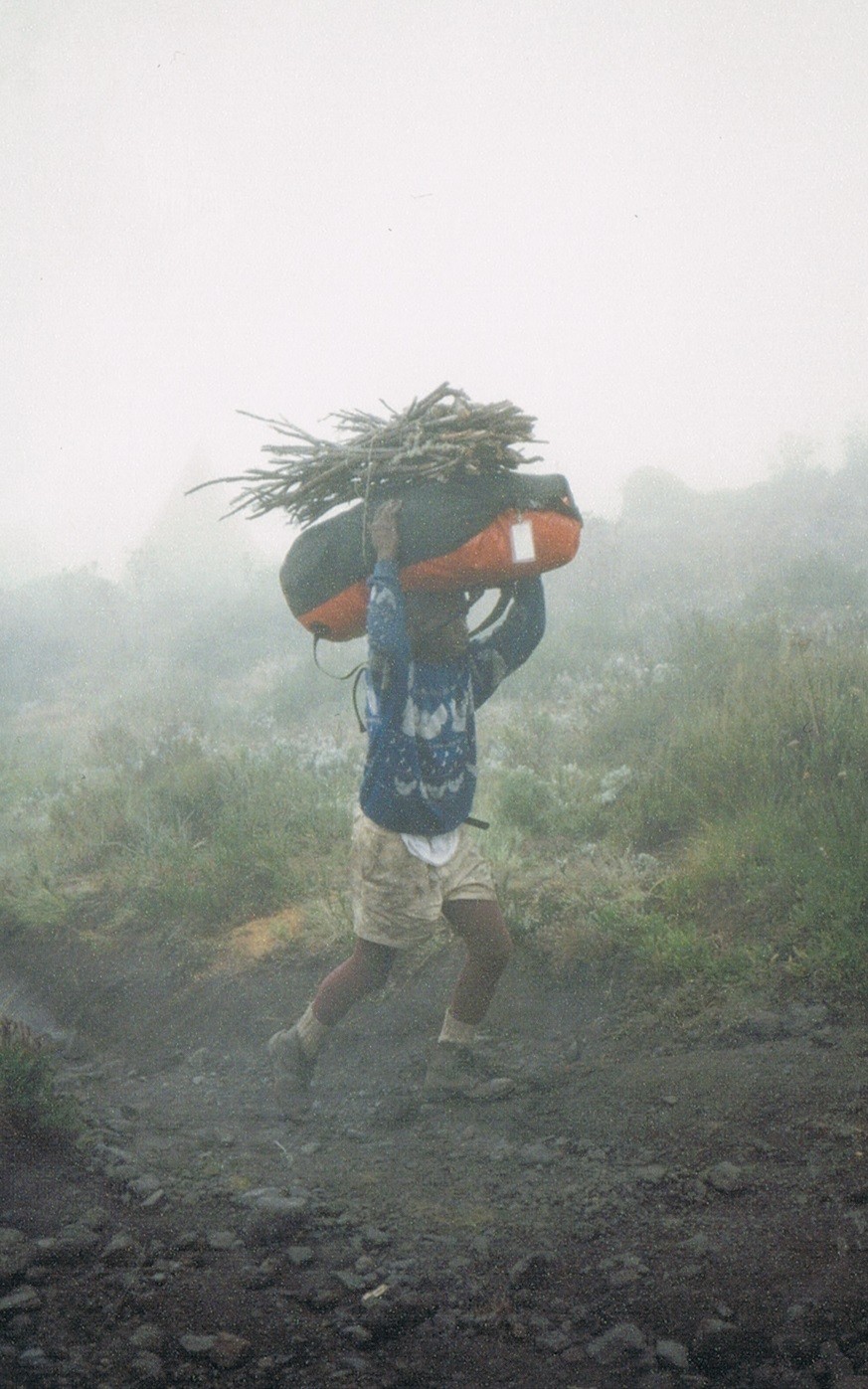 Wir gingen aber trotz des Regens relativ langsam. Auf halbem Weg zur Kibo Hütte holte uns Unser Führer Nikolaus ein, und blieb etwa eine halbe Stunde bei uns. Plötzlich murmelte er etwas, was ich nicht verstehen konnte, und lief voraus. Bald war er aus unserem Blickfeld verschwunden, was fast für den ganzen restlichen Weg so bleiben sollte.